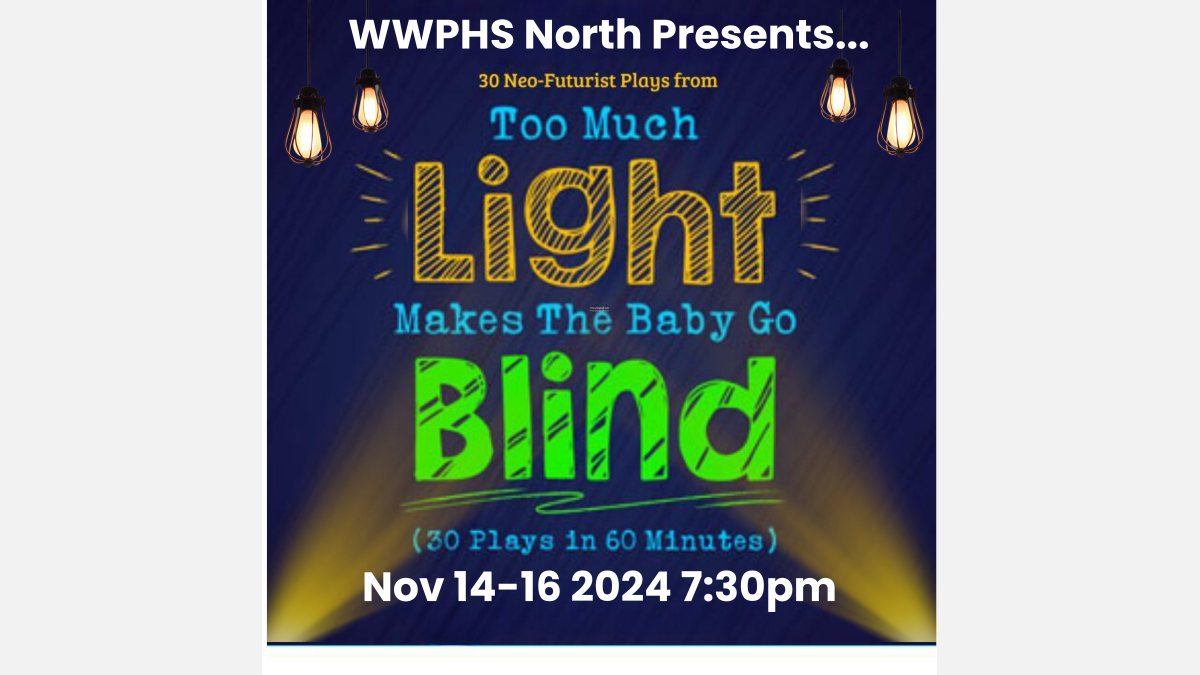 The collection of plays titled “Too Much Light Makes the Baby Go Blind” was created and first performed in 1988 by conceptionist Greg Allen and fellow actors in the Chicago area. “Too Much Light” has been in continual performance ever since. The original plays were styled after Neo-futurism, in which each script is true to the facts of the performer-author’s life. In trying to keep with that tradition while still enabling professional and amateur groups to present the show, the 30 plays ready to hit the North stage are ones the cast can make their own, even though they are not the original authors. Many of the plays are about the ups and downs of relationships. Others are about the art of acting. Some focus on world issues as relevant today as they were in the years they were written. The interpretations of this cast, as they use their lived experiences to inform their performances, make “Too Much Light” a unique HSN Fall Drama event. Also unique is the audience participation feature. The order in which the plays are performed is different each time, determined by the choices of the audience on hand each night. Audience members are also incorporated into the plays themselves! If you would like an exciting and immersive night of theater, come be a part of “30 Neo-futurist Plays from Too Much Light Makes the Baby Go Blind (30 plays in 60 minutes).” You can join the actors on stage November 14, 15 and 16 at 7:30 pm. Tickets are online at wwpnorththeater.org and at the door. Although the Chicago performances charged $9.oo + whatever number was thrown on a six-sided die - WWPHSN Fall Drama tickets are all $10 each.